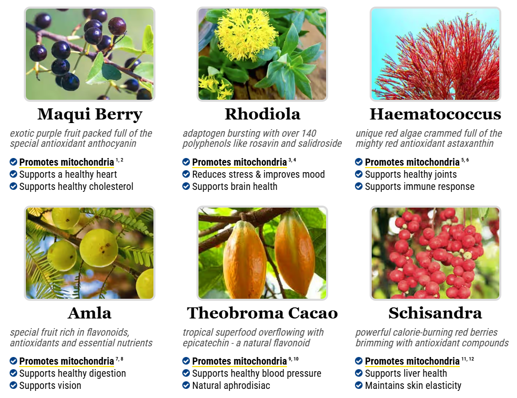It is one of the only products in the world with a proprietary blend of 6 exotic nutrients and plants designed to support healthy mitochondria levels!